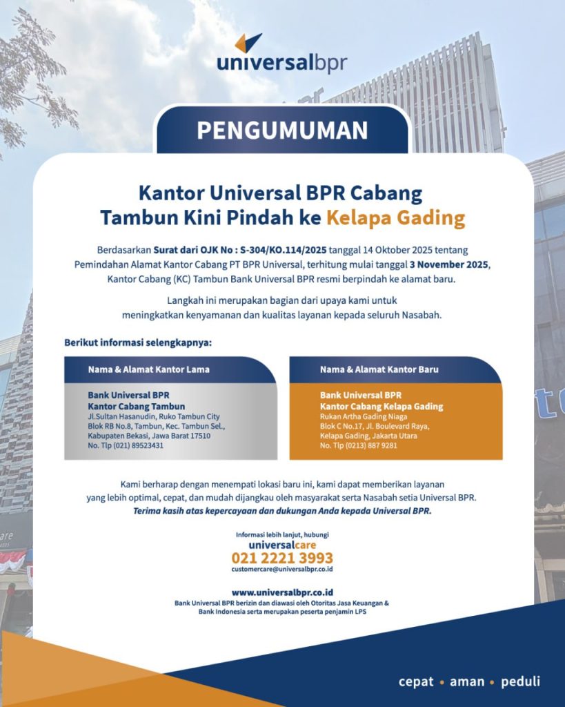 Berdasarkan Surat dari OJK No : S-304/KO.114/2025 tanggal 14 Oktober 2025, terhitung mulai 3 November 2025, Kantor Cabang Tambun Universal BPR resmi berpindah ke lokasi baru di Kelapa Gading, Jakarta Utara.